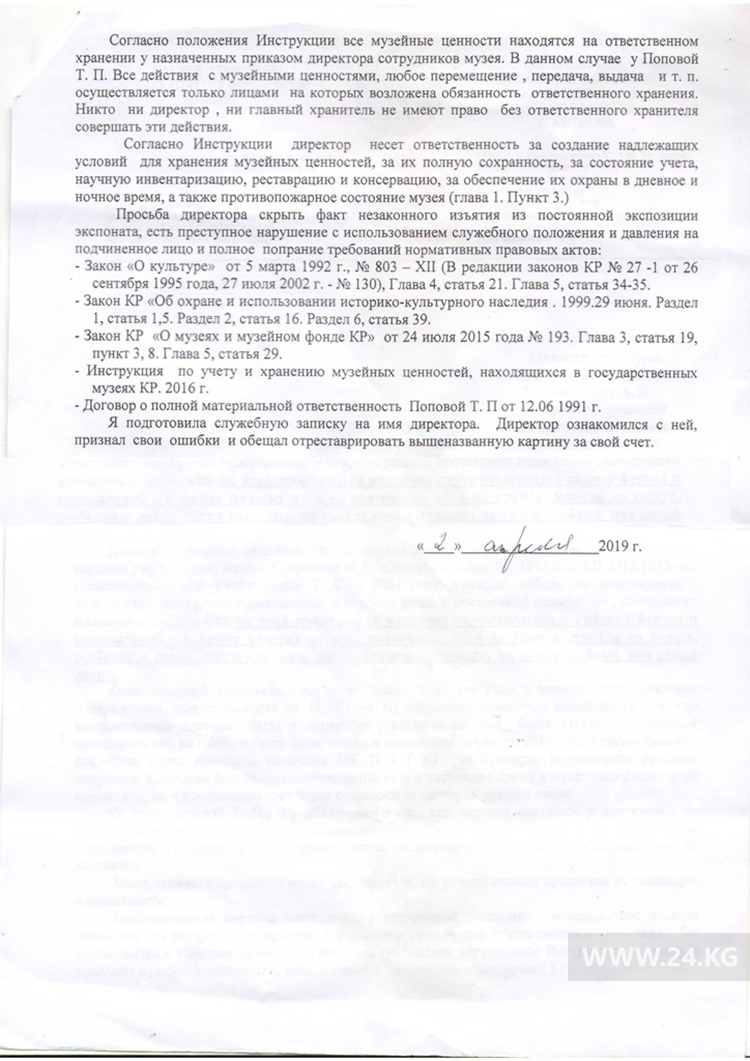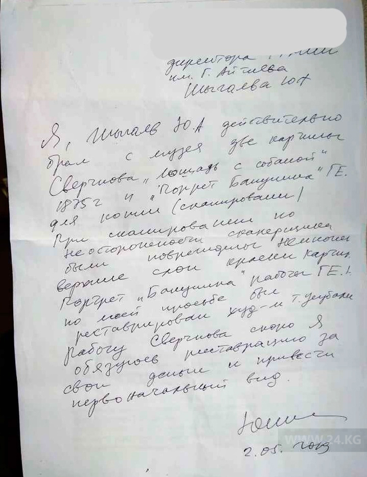 В распоряжении 24-kg.com попала расписка народного художника Шыгаева, в которой он признает, что взял картины из хранилища для сканирования и повредил их. Обязуется возместить затраты на реставрацию.