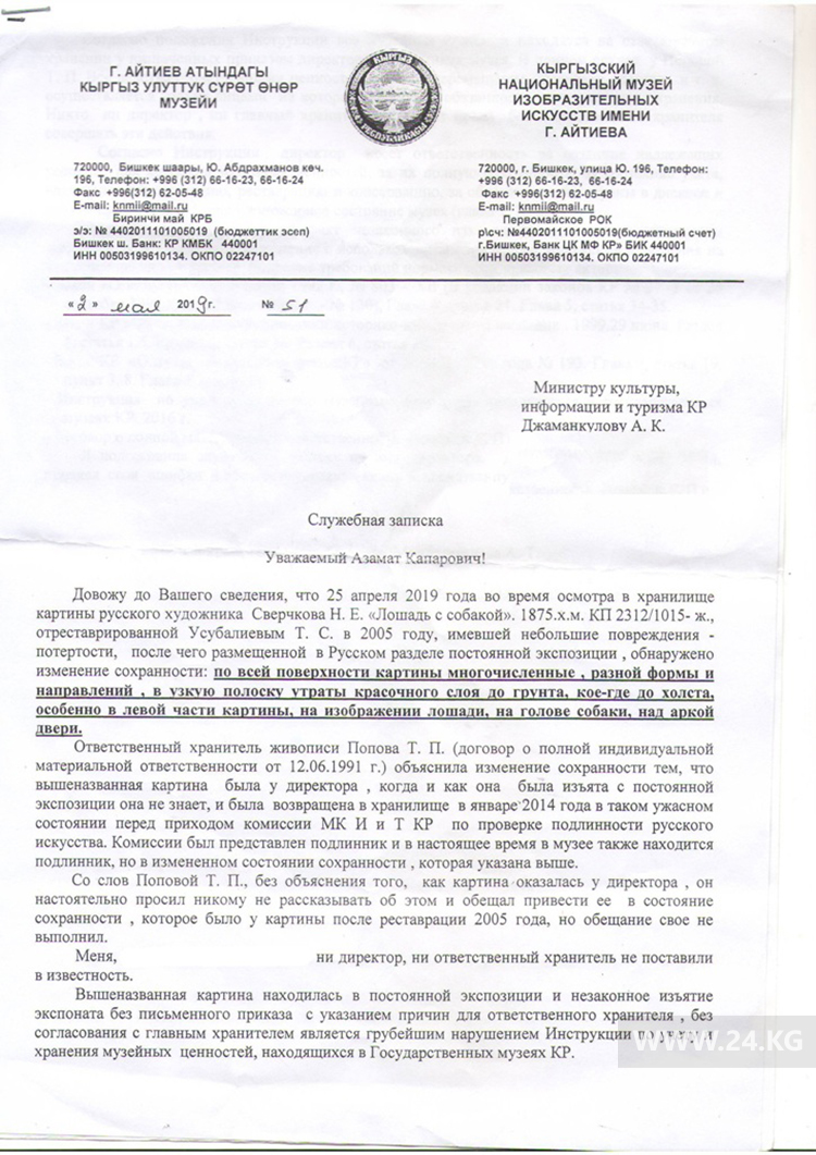 Отметим, что в служебной записке на имя Азамата Жаманкулова, датированной 2 мая 2019 года, указано, что картина Николая Сверчкова «Лошадь с собакой», отреставрированная в 2005-м председателем Союза художников Таалайбеком Усубалиевым, была значительно повреждена. Ответственный хранитель живописи Попова пояснила, что полотно исчезло из хранилища и появилось там в таком плачевном состоянии только в январе 2014 года. Картина находилась у Юристанбека Шыгаева. Он обещал привести полотно в порядок, обещание не сдержал.