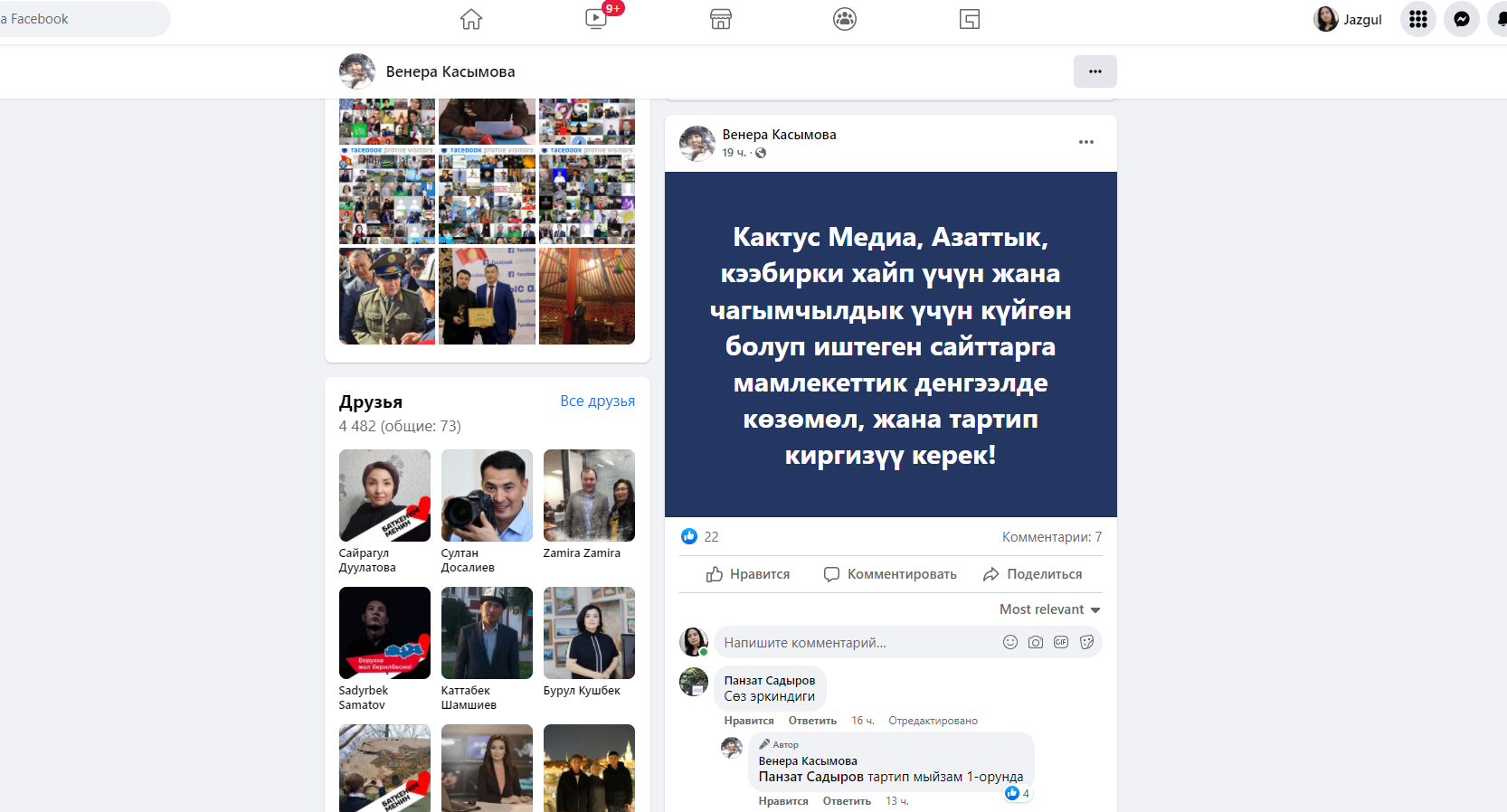 «Мы не выступаем против СМИ. Журналисты у нас четвертая власть. Мы, когда случается беда, идем к журналистам. Но есть некоторые СМИ, которые финансируются извне. Например, американские «Азаттык» и «Клооп» или российский «Кактус». У них даже домен — org, который опасен для Кыргызстана», — сказал Илимбек Исраилов. Он посетовал, что прошло десять дней, а результатов расследования по делу Kaktus.media нет.