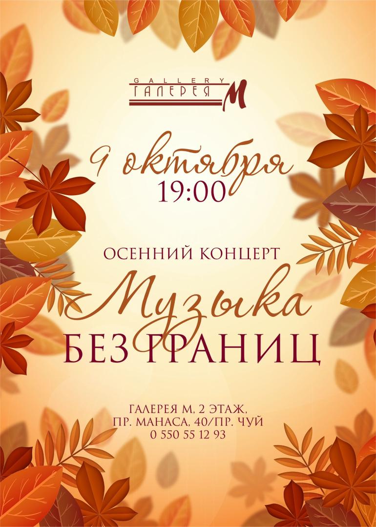 Осенний концерт «Музыка без границ» пройдет 9 октября в «Галерее М». Об этом 24-kg.com сообщили организаторы.